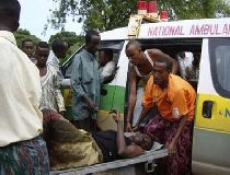 A Somali man, injured during clashes between opposition fighters and government forces, is carried to a hospital in Mogadishu, July 4, 2009.